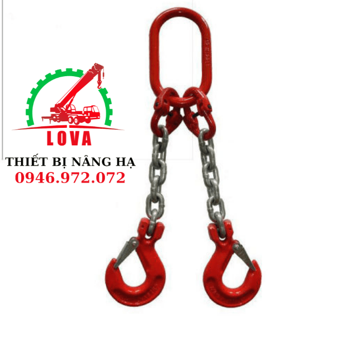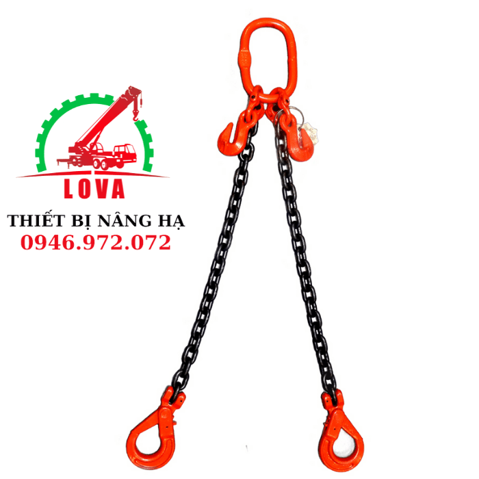 Dây xích cẩu 2 nhánh lắp móc chốt lưỡi gà là chùm xích cẩu được sản xuất theo tiêu chuẩn Nhật Bản, an toàn cao. Các phụ kiện lắp ráp thành chùm xích như : Vòng khuyên, khóa nối xích, móc cẩu, xích chịu lực đều được sản xuất theo tiêu chuẩn G80- đạt chuẩn quốc tế