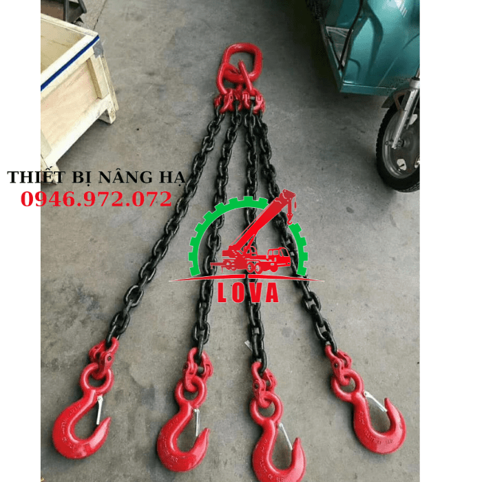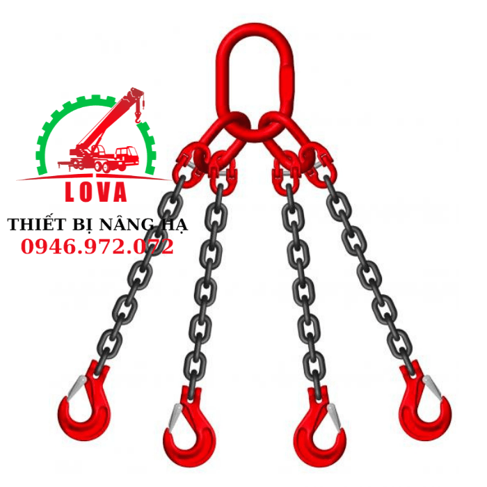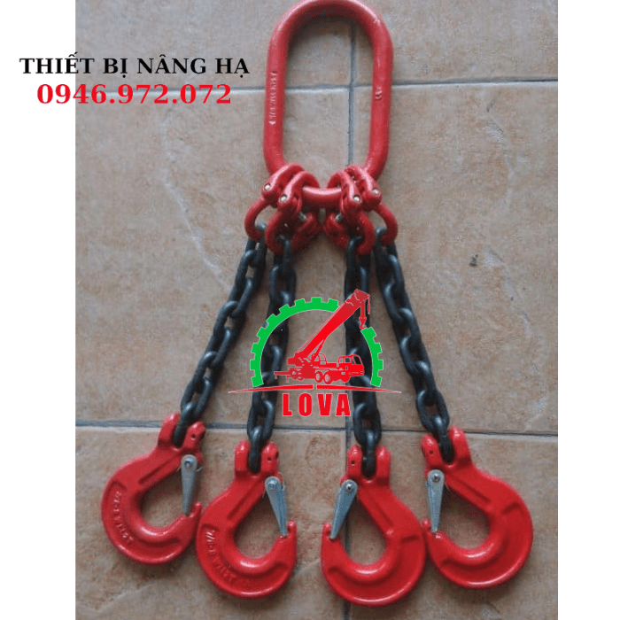 Là bộ xích cẩu gồm 4 chân được kết nối bởi các phụ kiện gồm : 01 vòng khuyên đôi, 04 khóa nối xích để kết nối giữa vòng khuyên và dây xích, 04 dây xích có chiều dài tùy theo yêu cầu của người sử dụng và 04 móc cẩu có chốt lưỡi gà chống trượt.