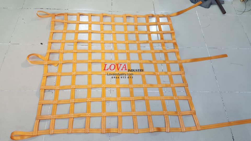 Lưới cẩu hàng dây bẹ bản 50mm, 35mm, 25mm là sản phẩm bảo vệ hàng, lưới bao hàng, lưới cẩu hàng, lưới chùm hàng trong siêu thị, lưới ngăn hàng hóa kho, lưới dùng trong khu chế xuất công nghiệp