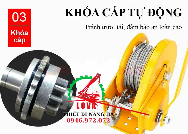 - TỜI QUAY TAY 1200lbs 545kg dùng cáp TỰ KHÓA là thiết bị được lựa chọn nhiều trong việc nâng hạ hàng hóa ở vị trí chật hẹp, thay cho việc dùng palang xích kéo tay. Tời được dùng bằng tay thông qua trục quay trên thân tời làm quay cơ cấu chuyển động để thực hiện việc quay tang tời, quấn hoặc nhả cáp theo ý muốn.